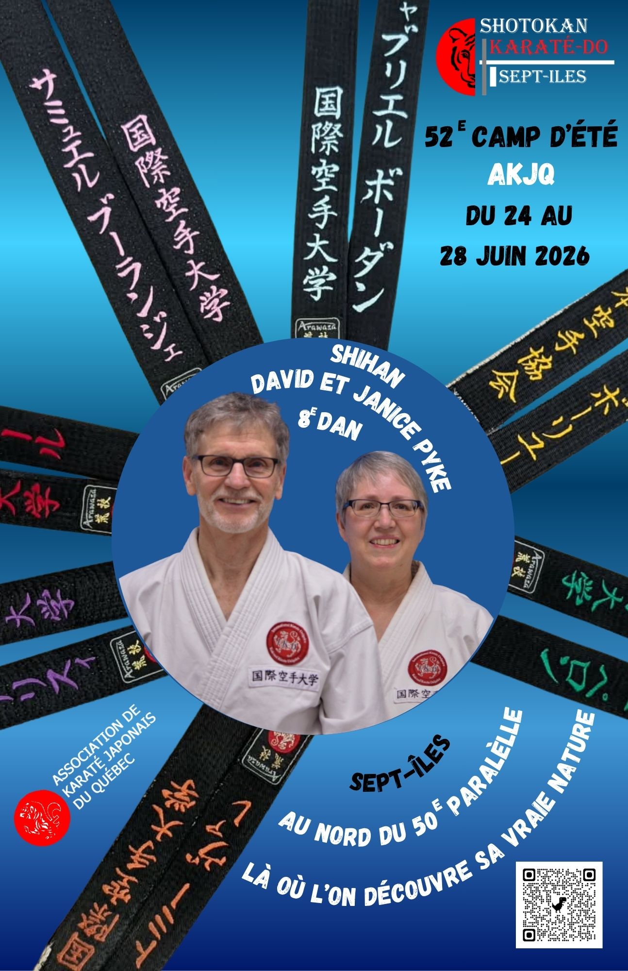 Shotokan karaté-do Sept-Iles vous invite sur la Côte-Nord pour participer au 52ème camp d'été de l'AKJQ. Nos instructeurs invités sont shihan David Pyke, 8ème dan et shihan Janice Pyke 8ème dan tous les deux membres de l'IKD.